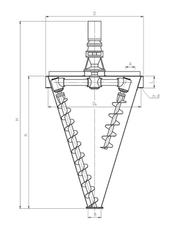 混合容器為倒錐體,當(dāng) V<10m3 時機(jī)內(nèi)兩根螺旋采用懸臂非對稱結(jié)構(gòu),長螺旋靠錐壁安裝,短螺旋靠近中心部位安裝;長螺旋直徑小,短螺旋直徑大;因而大大增強(qiáng)了中心區(qū)域的攪拌效果,提高了混合效率和混合精度。